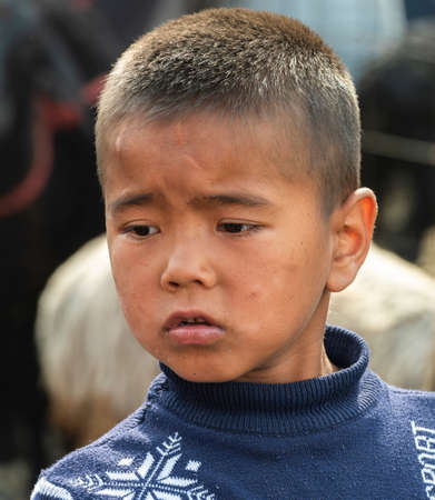 Karakol, Kyrgyzstan - July 14, 2019: Boy at livestock market with cows and many people and farmers in the city of Karakol in Kyrgyzstan.
