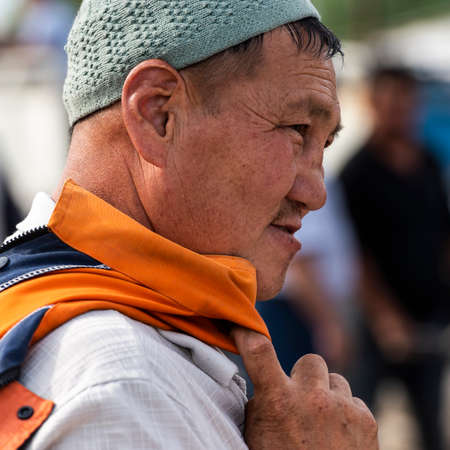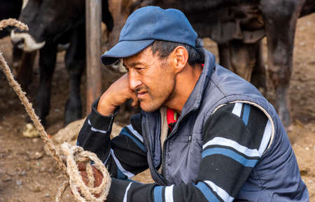 Karakol, Kyrgyzstan - July 14, 2019: Man at livestock market in the city of Karakol in Kyrgyzstan.