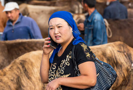 Karakol, Kyrgyzstan - July 14, 2019: Woman with phone at livestock market with many people and farmers in the city of Karakol in Kyrgyzstan.