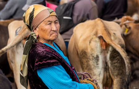 Karakol, Kyrgyzstan - July 14, 2019: Woman at livestock market with many people and farmers in the city of Karakol in Kyrgyzstan.