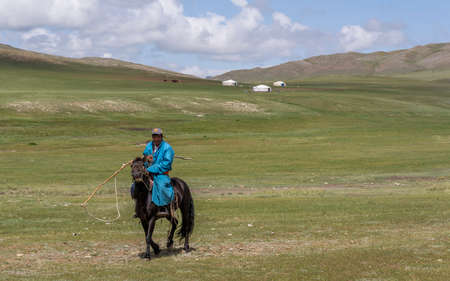 Baruuntunuun, Mongolia - August 8, 2019: Steppe with Yurts and shepherd on horseback, hills and mountains in Mongolia.