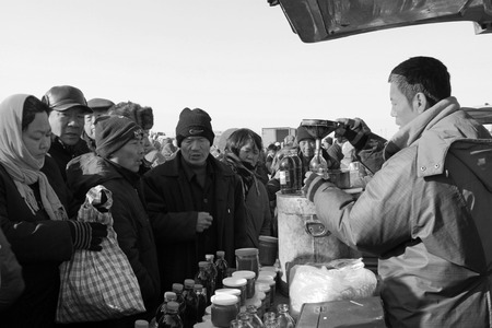 LUANNAN COUNTY - JANUARY 28: The vendor busy filling balm, in refined balm booth, on january 28, 2014, Luannan county, Hebei province, China.