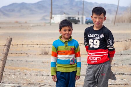 Mongolia Ulgii 2019-05-05 Two Mongolian boys in colorful clothes stand near fence of barbed wire in steppe on background of mountains. Concept of homeless child, orphan