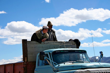 LHASA, TIBET, CHINA - AUGUST, 17 2018: Tibetan pilgrims in the Ganden Monastery located at the top of Wangbur Mountain, Lhasa Tibet