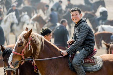 Son Kol, Kyrgyzstan - circa September 2011: Smiling native man poses with his mother in Son Kol, Kyrgyzstan. In the backgroud with young boy on horse. Documentary editorial.