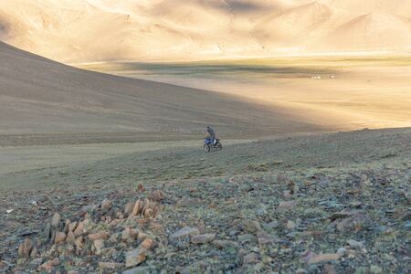 Altai, Mongolia - June 14, 2017: Mongolian men ride motorbike at steppe field on mountain background Concept authentic local asian transport and culture.