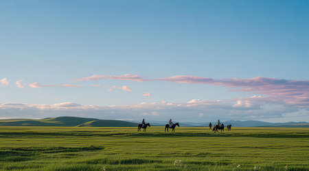 Beautiful landscape with horses in the steppe at sunset. Mongolia