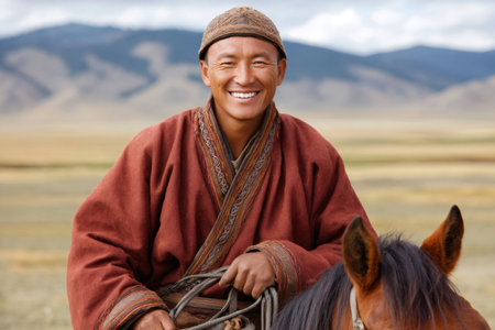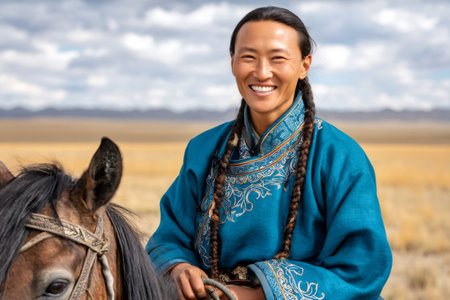 Nomad with his faithful horse in the steppes of Mongolia