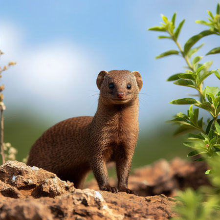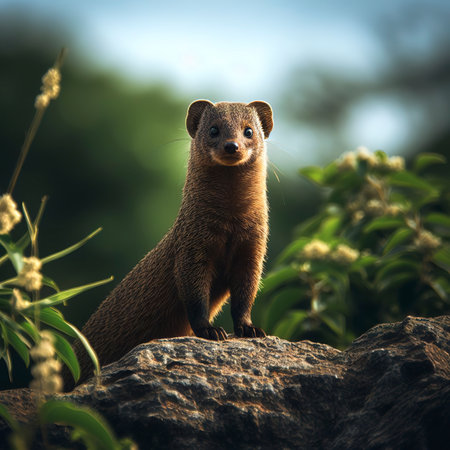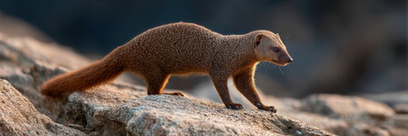 Mongoose standing on a rock in the morning light with copy space