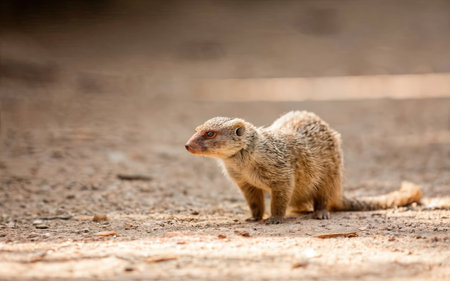 Cute common dwarf mongoose, Helogale parvula, on a sandy ground. Mongoose species native to Angola, northern Namibia, KwaZulu-Natal in South Africa, Zambia and East Africa.