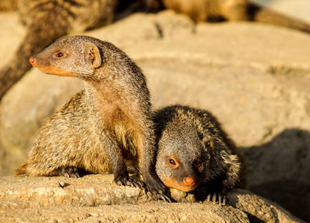 Portrait of two Banded mongoose - Mungos mungo on the stones