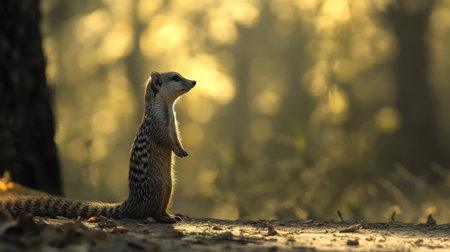 A common mongoose standing upright on its hind legs, surveying the area for predators in a sunlit clearing.
