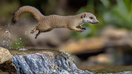 A dynamic capture of a common mongoose leaping over a small stream, its agile body frozen mid-air.