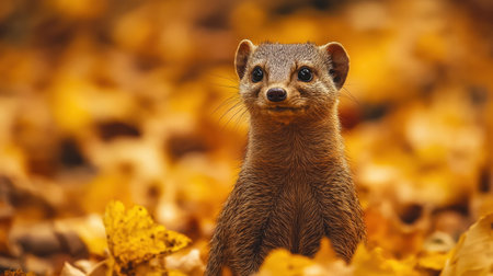 A portrait of a common mongoose standing against a backdrop of golden autumn leaves in a European woodland.