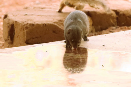 Dwarf mongoose drinking water from a puddle in a private reserve in South Africa.