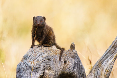 Banded mongoose is a lookout on a tree stump