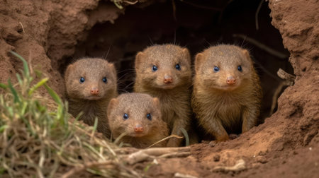 A family of dwarf mongooses nested in a hole created with Generative AI