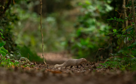 A common mongoose mid-stride on a dirt path in a Mediterranean forest, showcasing its agile movement and keen awareness.