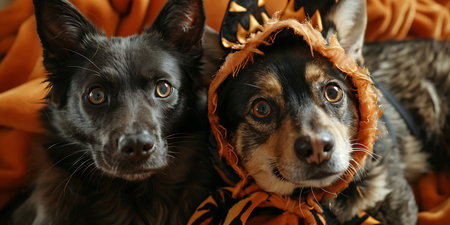 Cat and dog, wearing costume for Halloween on solid background, Happy Halloween - Ai Generated
