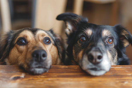 Adorable CloseUp of Two Dogs Resting Heads on Wooden Table.