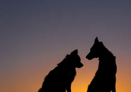 Silhouette of a pomeranian dog and another border collie at sunset. Animal love. Best friends. Selective focus. Copy space.