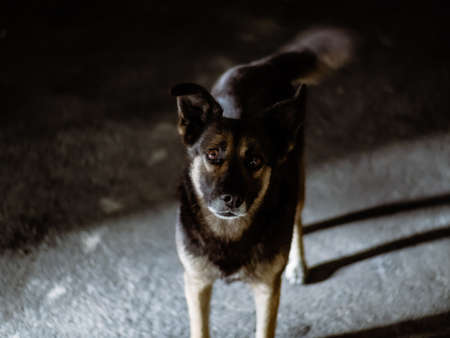 a mongrel dog with sad eyes looks up at a person. Perhaps sad from loneliness or bored