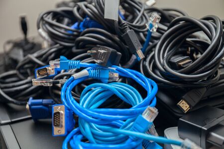 computer peripherals wires for connecting devices monitor, internet cable and coaxial