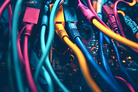 Close-up of colorful network cables in a server setup technology concept