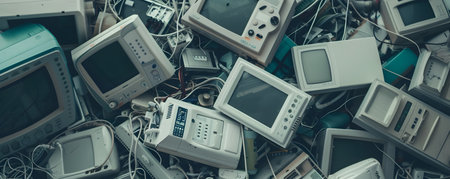 Cluttered heap of obsolete discarded and damaged medical electronic devices computers