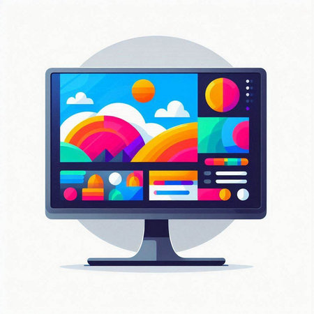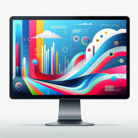 Computer monitor with colorful abstract design on white background. Vector illustration.