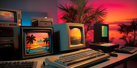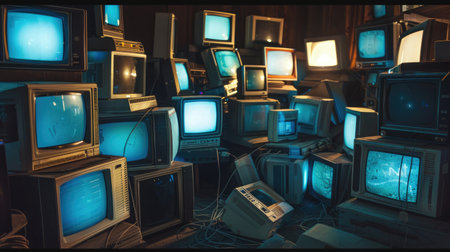A vibrant installation of old computer monitors against a clear blue sky, representing technology evolution and vintage aesthetics, creating a nostalgic atmosphere