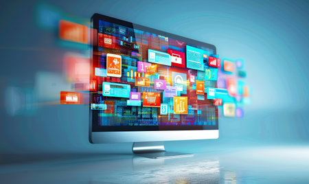 A striking image of a computer screen displaying a graphic design software interface, with vibrant colors and shapes being manipulated in real-time