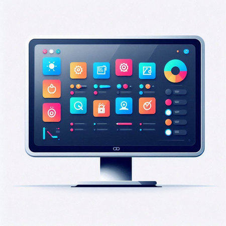 Computer monitor with colorful application icons isolated on white background. Vector illustration.