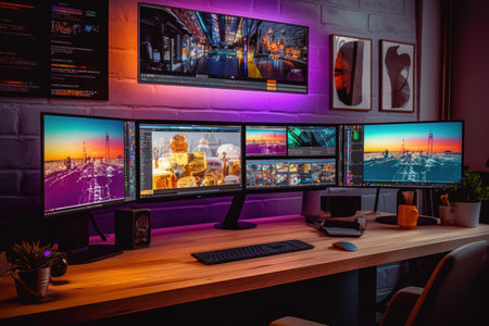 A focused workspace with multiple monitors displaying project interfaces and neon lighting