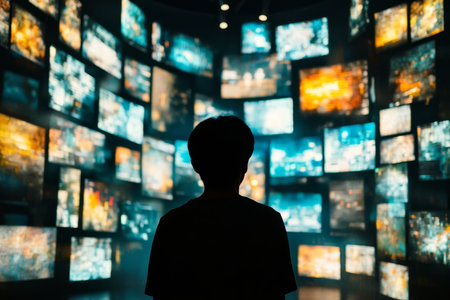 Silhouette of a person against multiple screens illustrating multitasking and digital entertainment