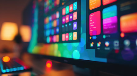 A modern computer monitor showcases a vibrant bokeh background with colorful lights, creating a cozy atmosphere in a stylish workspace filled with tranquility.