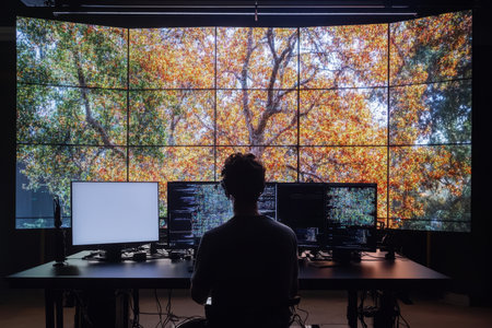 A tech expert focuses on multiple screens in an office setting, with colorful autumn foliage visible outside.