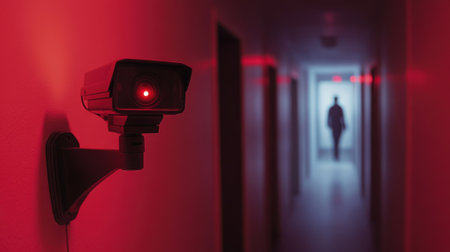 Surveillance Camera in a Dimly Lit Red Hallway with a Mysterious Figure. High quality photo
