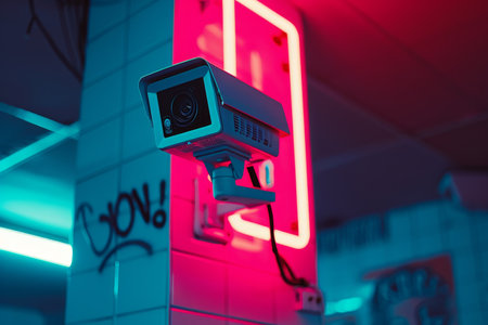 A sleek surveillance camera mounted on a textured wall captures attention with its modern design. Dim light enhances its vigilant presence, ensuring security.