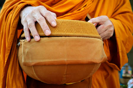 hand of monk dressing orange robe, holding bowl during reception of alms, around buddhist temple