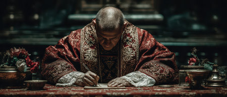 An elderly monk dressed in intricate robes sits at a table focused on writing scripture with radiant decorations surrounding him.
