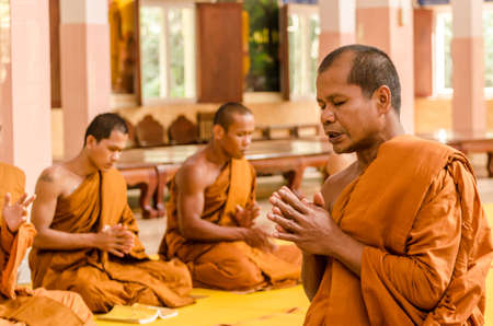 SAKONNAKHON,THAILAND December 23: Newly ordained Buddhist monk pray with priest procession. Newly ordained Buddhist monks have a ritual in the temple procession in December 23, 2012