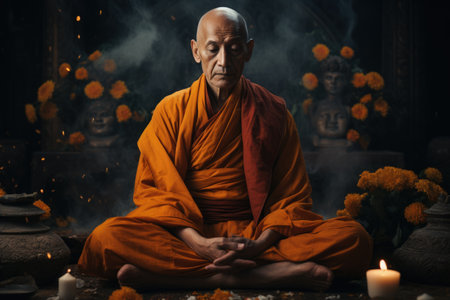 A serene scene showcasing a monk in an orange robe meditating in front of glowing candles, embodying tranquility and spiritual depth.