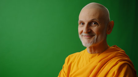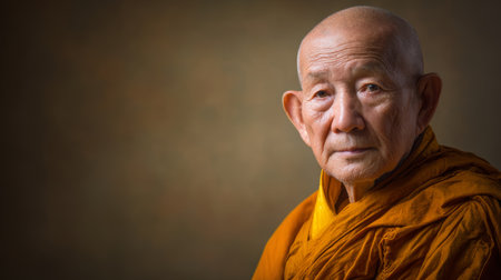 Elderly monk wearing traditional orange robe with calm expression and soft lighting on neutral background