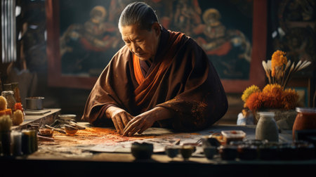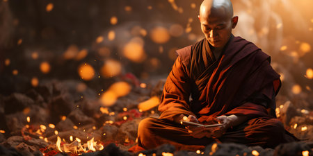 Redrobed monk conducts ancient rituals in spiritual temple amidst tranquil ambience. Concept Religious Practices, Spiritual Rituals, Monastic Life, Tranquil Temples, Ancient Traditions