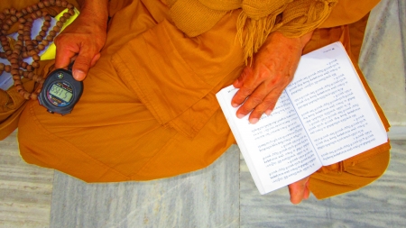 Monk praying at the courtyard of Mahabodhi temple , Bodhgaya. Keeping watch. Shot at 1703 pm on 10.08.12 at Bodhgaya, Bihar, India, Asia.