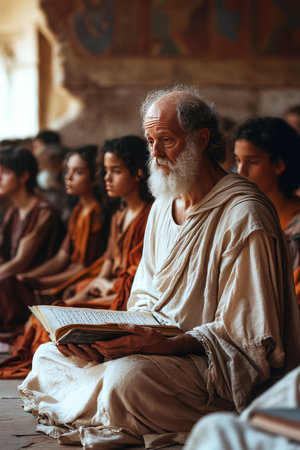 In an ancient setting Aristotle reads a lecture from a papyrus to a group of attentive teenagers who are dressed in simple clothing. The students listen intently surrounded by stone walls.
