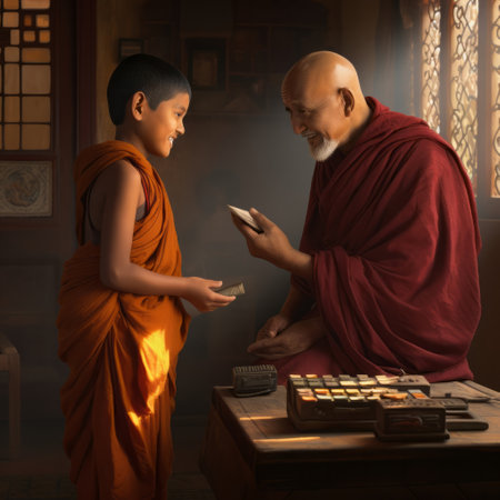 indian boy giving his calculator to his monk grandfather , generated by AI. High-quality photo