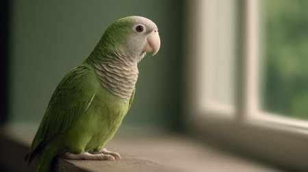 A serene green parrot perched gracefully on a windowsill, illuminated by soft natural light, capturing the beauty of everyday moments in a calm environment.