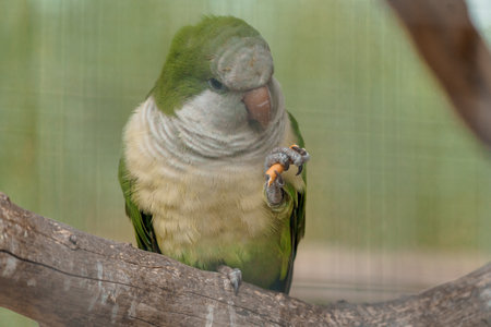 Vibrant Monk Parakeet Perched on a Branch with a Snack in its Clawed Foot.